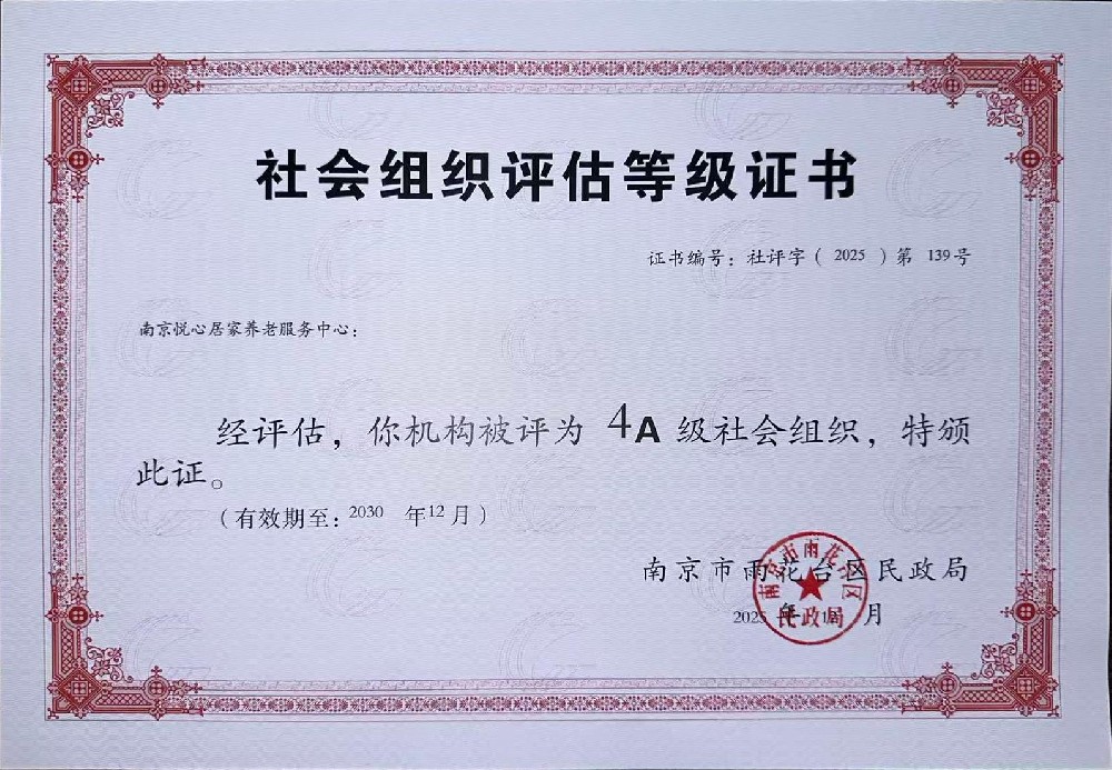 喜讯 | 南京悦心居家养老服务中心获评4A级社会组织